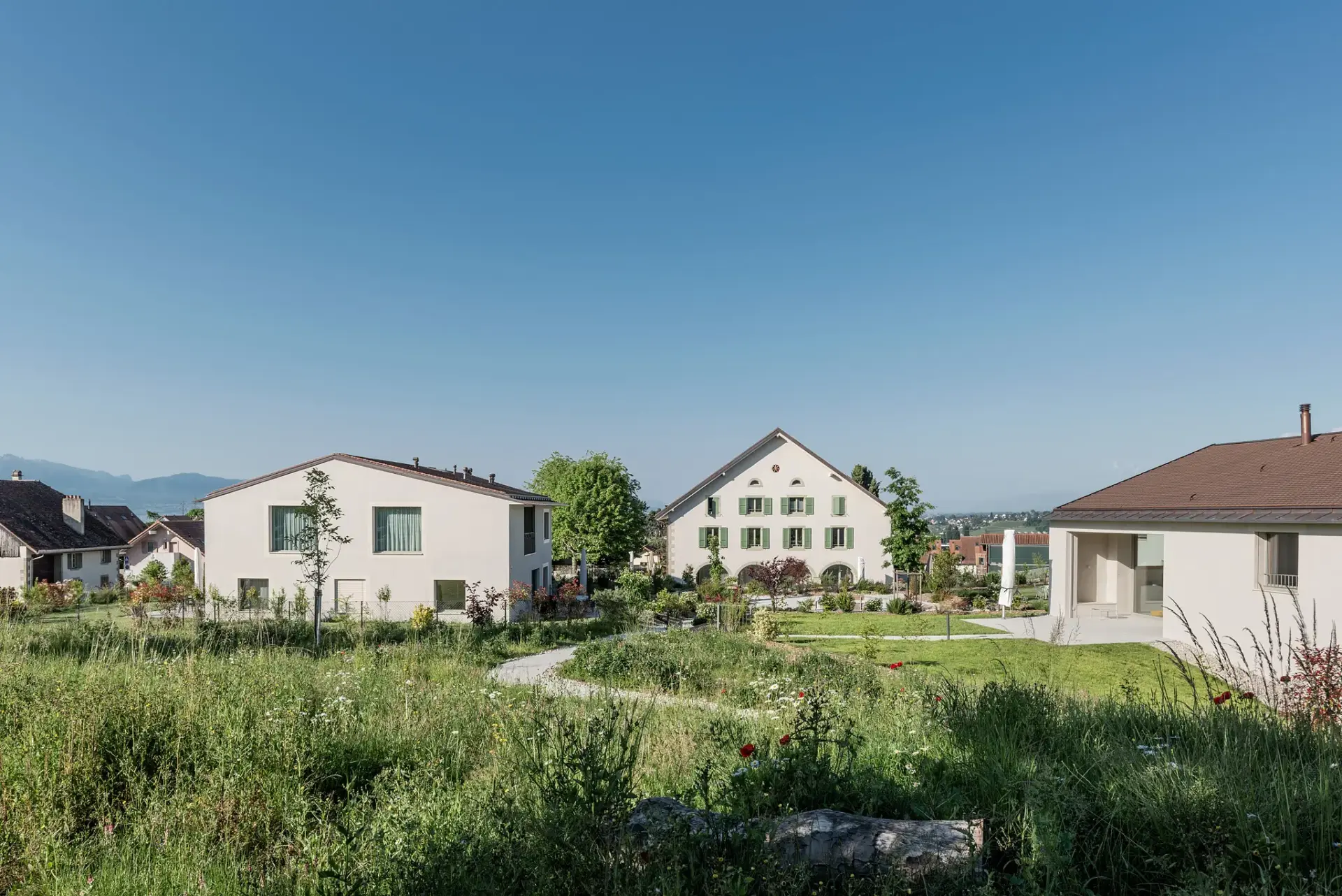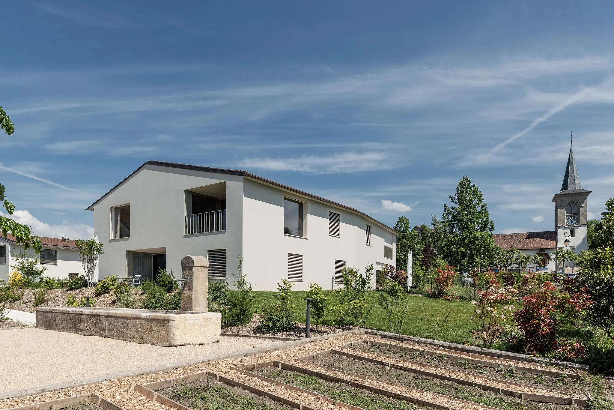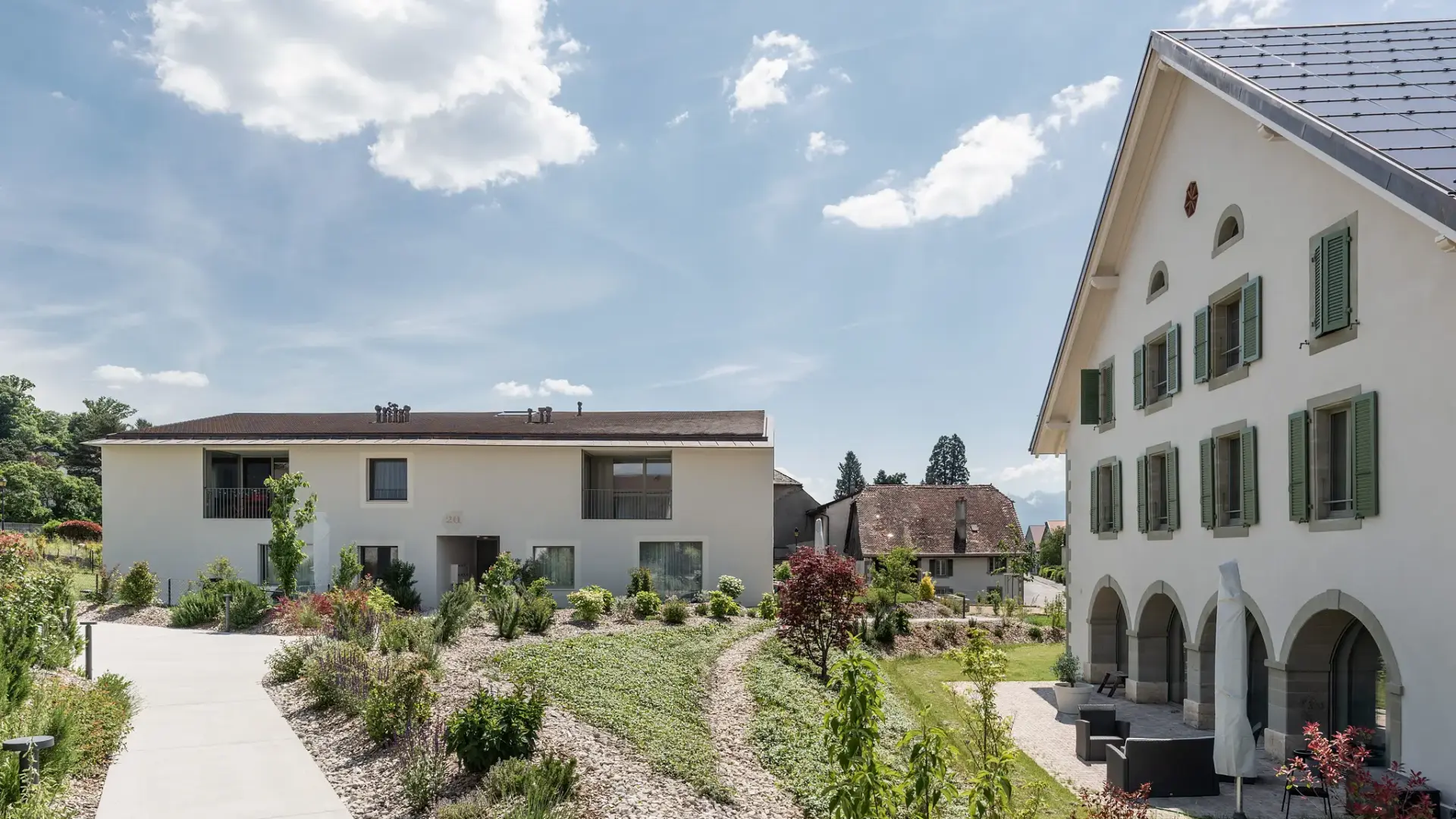 Le Domaine du Village totalise 14 logements du 2.5 au 6.5 pièces répartis dans trois bâtiments distincts. Ces bâtisses, au style contemporain, sont inspirées des traits de l’architecture traditionnelle romande. Le cabinet d’architectes Fiona Pia a projeté cette réalisation avec le plus grand soin. La qualité des espaces ainsi que la luminosité des logements ont été au centre de toutes leurs réflexions.
